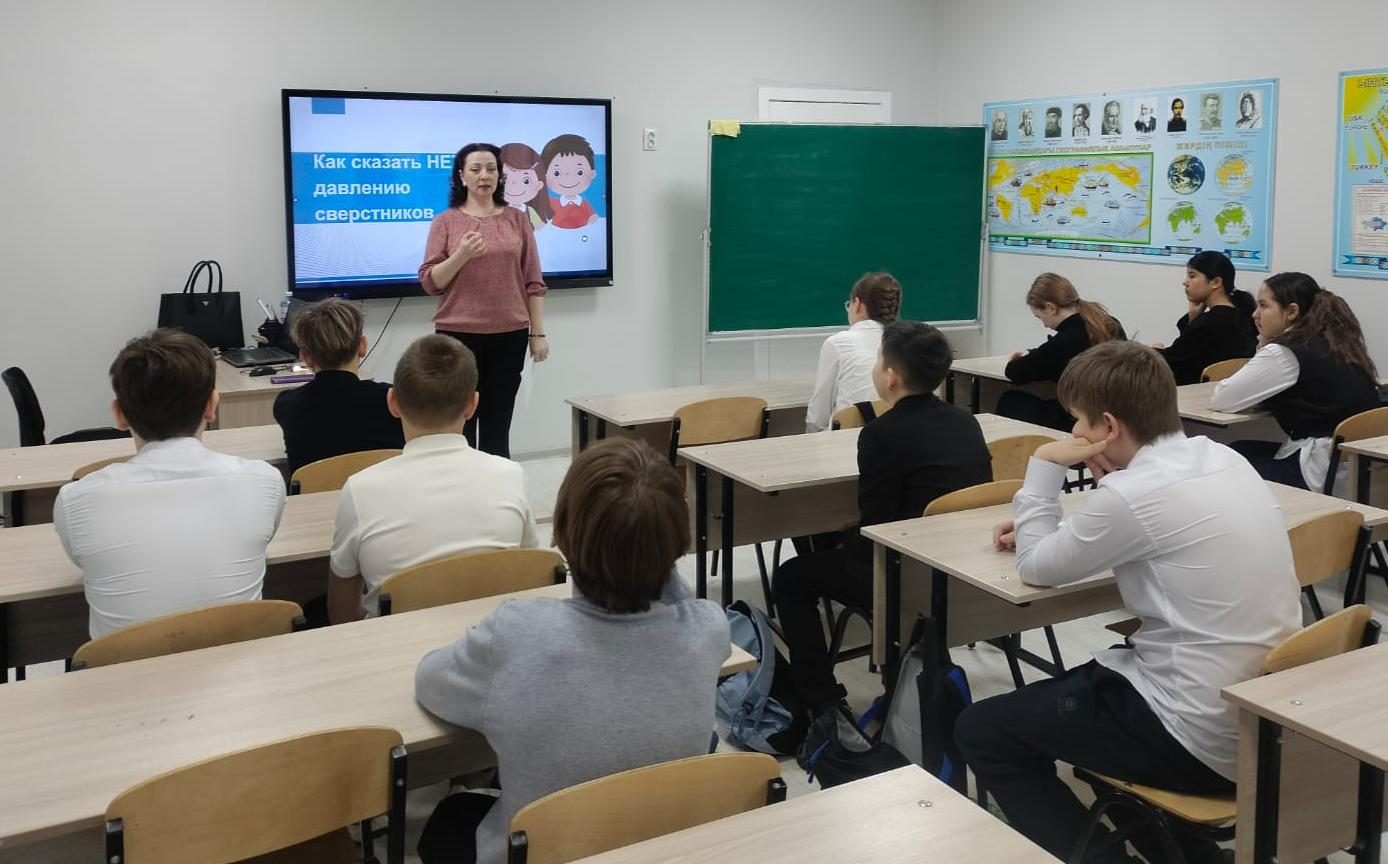 16, 17, 23.02., 11.03.2026 ж. - 7 "В", 7" Г", 8" В", 9" Б "Сыныптарында"құрдастарының қысымына қалай жоқ деп айту керек" тақырыбында сабақ өтті.