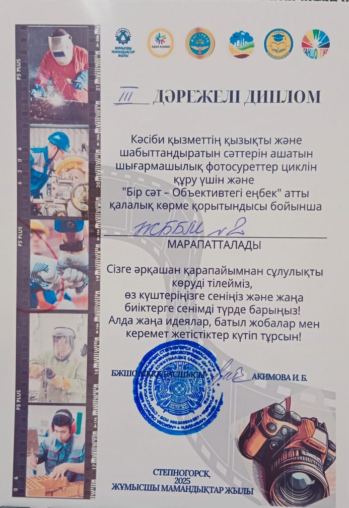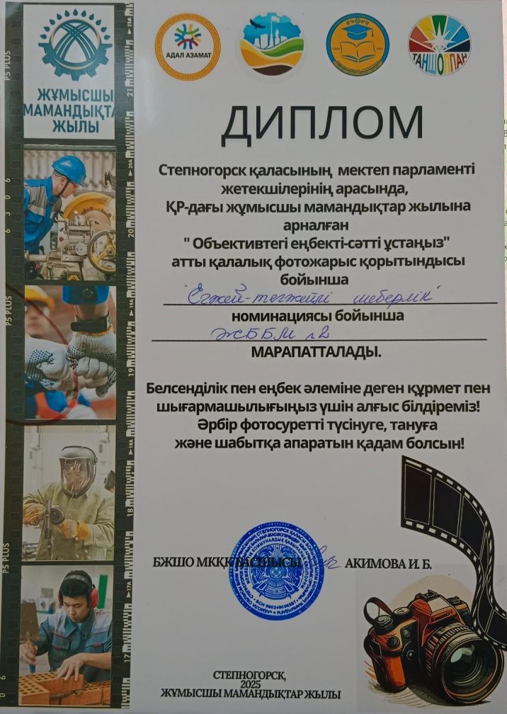 Құттықтаймыз! "Мектеп Паламентінің" мүшелері "Бір сәт - Объективтегі еңбек" атты қалалық көрмеге қатысы ІІІ дәрежелі дипломмен марапатталды. Топ жетекшісі: Кәкім А.А.